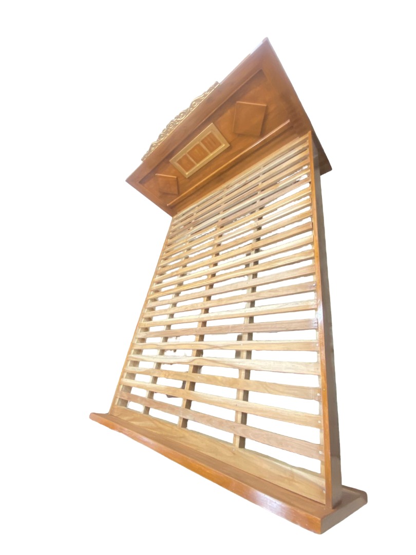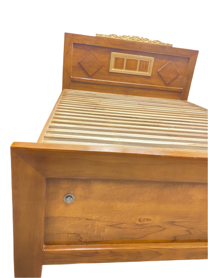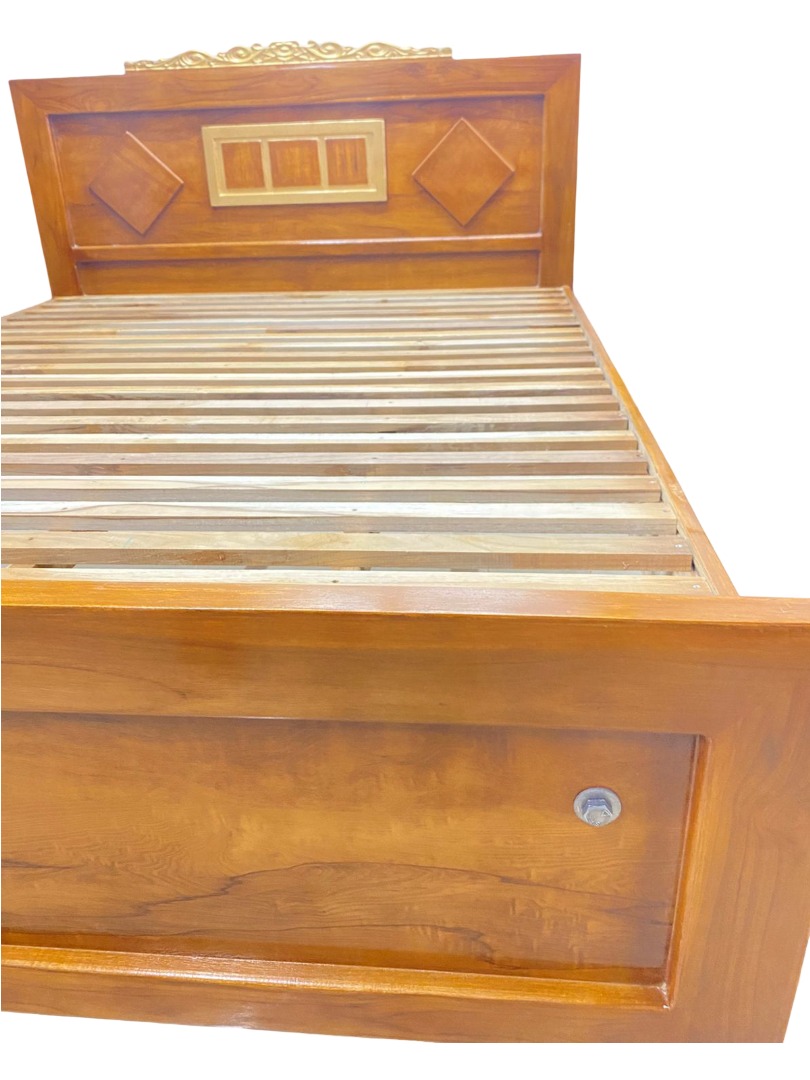 This elegant wooden cot combines traditional craftsmanship with functional design. Made from high-quality solid wood, it features a smooth natural finish that highlights the rich wood grain. The headboard is beautifully designed with diamond-shaped inlays and a central panel, topped with a decorative gold carving for a royal touch. The sturdy slatted base ensures excellent mattress support and ventilation. Its robust frame, visible bolt assembly, and fine joinery reflect durability and long-term reliability. Perfect for bedrooms, guest rooms, or hostels, this cot adds both charm and comfort to any space. A timeless piece that blends aesthetic appeal with everyday practicality.| in trichy